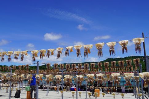 夏になると、漁師たちが獲ったトビイカを干している光景が、奥武島ならではの風景です。毎年7月から10月ごろに販売されています。