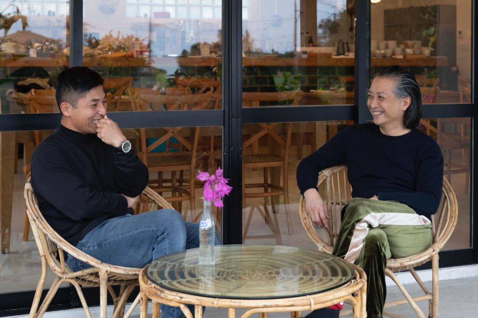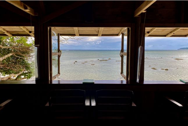 南城市玉城、さちばるの海を目前にした「浜辺の茶屋」。この場所は、稲福さんの父の稲福信吉さんが「ありのままの沖縄の自然を生かすカフェ」として1994年にオープンしたカフェ。力強く迫り出す琉球石灰岩や、南国特有の木々を生かしたロケーションカフェは、世界中から観光客が多く訪れる人気スポット。