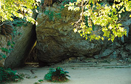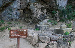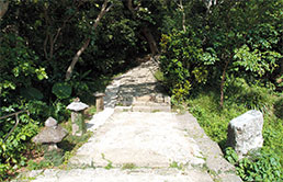 門から上がって歩いていくと左手に見えてくる最初の拝所です。大広間や一番座という意味をもち、石段が一段上がっているのは屋敷に上がるのと同じイメージ。ここは祈りの場所です。大きな目の前の岩に向かって祈りと思いを交わしましょう。
