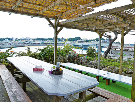 奥武島の橋を渡る手前を左へ。漁師の家族が何度も試作を重ねて作り出した極上の「もずくそば」がそこにあります。もずくを練りこんだツルツルの麺は、一度口にすればファンになること必至。【詳細ページ】