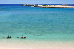- うみかぜホースファームショートコースでの乗馬をはじめ、サンゴ礁の海を乗馬したまま散歩する「海馬遊び」(夏期)や「ビーチライド」など子どもから大人まで楽しめます。